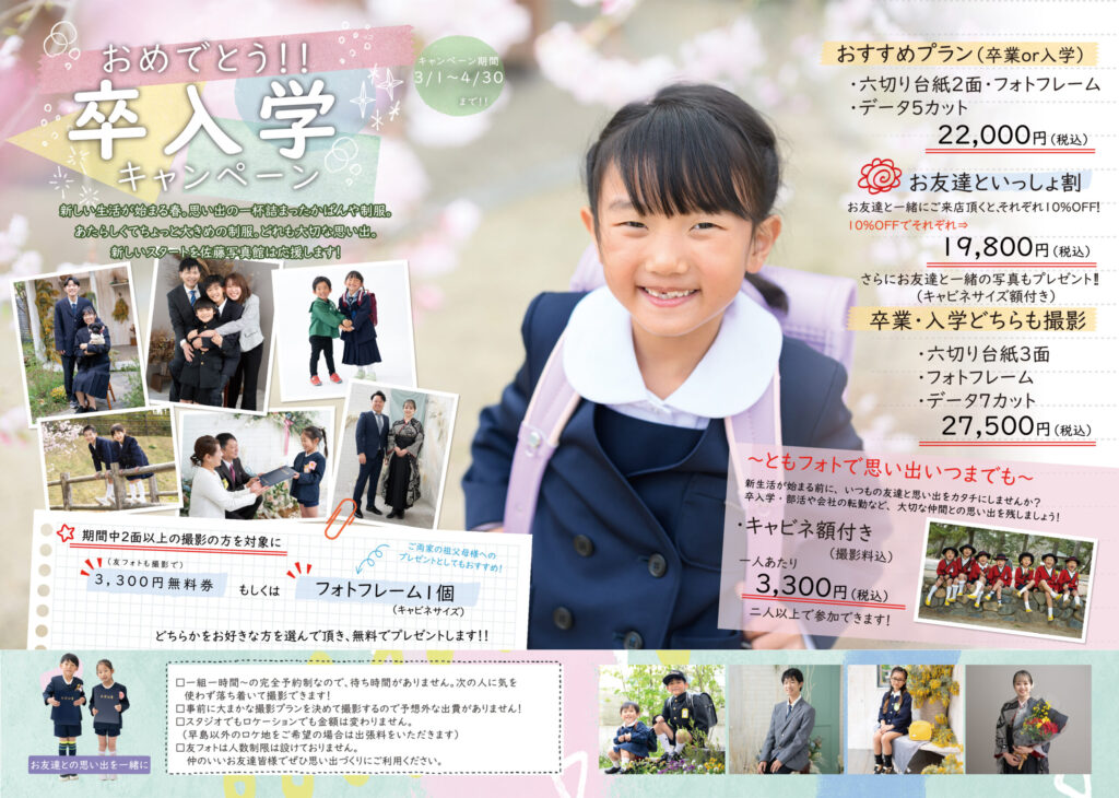 倉敷、岡山からアクセス抜群!早島の佐藤写真館です。 あっという間に春の気配がしてきましたね🌸皆様、新生活の準備は進んでいらっしゃいますか? 思い出がたくさん詰まった通学カバンや、まだ少し大きめの真新しい制服姿。この時期にしか見られないお子様の成長の証は、ご家族にとってかけがえのない宝物ですよね。 そんな大切な節目をあたたかい写真に残していただきたくて、佐藤写真館では毎年大好評の「春の卒入学キャンペーン」を今年も開催いたします!🌸