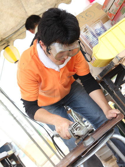 肉を焼く前に網や鉄板の掃除をします!さすが商工会!機械が本気です!