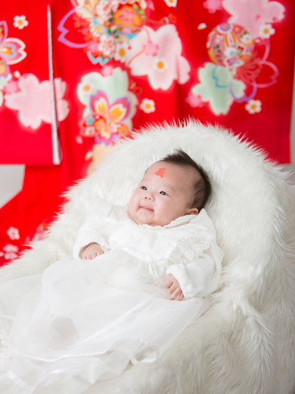 1か月のお宮参りだと表情がでにくく、寝ていることもおおいので100日でのお参り、撮影をお勧めしております。