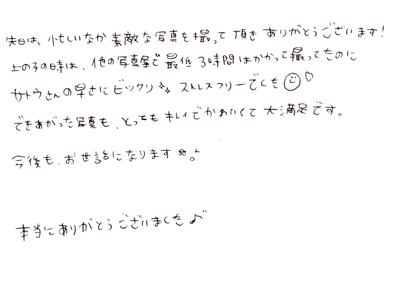 上の子の時は他の写真屋で最低3時間はかかって撮ってたのにサトウさんの速さにビックリ!ストレスフリーでした^o^
