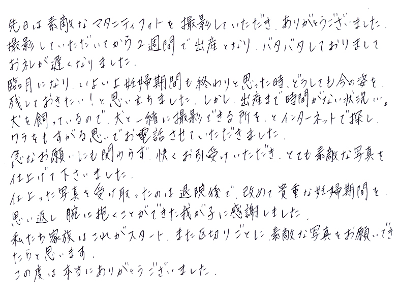 撮影していただいてから2週間で出産となりバタバタしておりましてお礼が遅くなりました