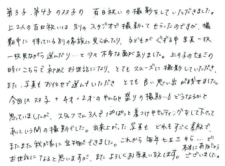 倉敷市からお宮参りの撮影でお越しのF様のお客様の声☆ 2017年12月22日 最終更新日時 : 2017年12月22日 kzn_rq_photo-satou 先日きていただいたおきゃくさまより感想をいただきました☆ こういうのもらえたら本当にめっちゃうれしいです^o^ ますますがんばっていきますよ~!
