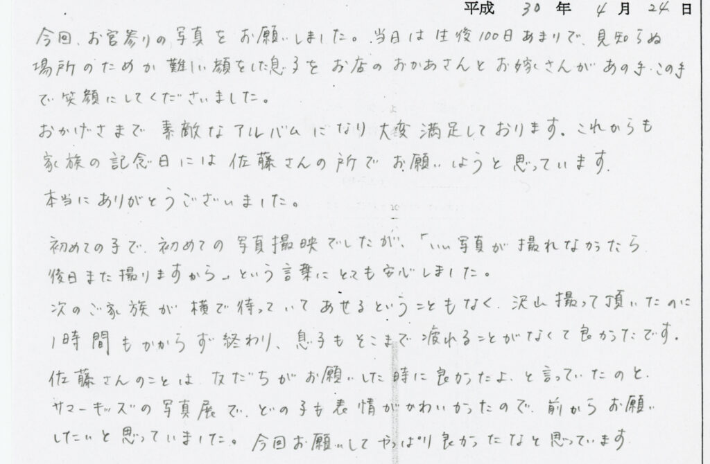 佐藤さんのことは友だちがお願いした時に’’良かったよ’’と言っていたのと、サマーキッズの写真展でどの子も表情がかわいかったので、前からお願いしたいと思っていました。今回お願いしてやっぱり良かったなと思っています。」