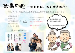いつも元気でいてくれるおじいちゃん・おばあちゃんを家族みんなで囲んで写真をプレゼントしませんか?? 「家族みんなで」「孫たちと」「ご夫婦おふたりで」「おひとりずつ」「ペットと一緒に」3カットま […]