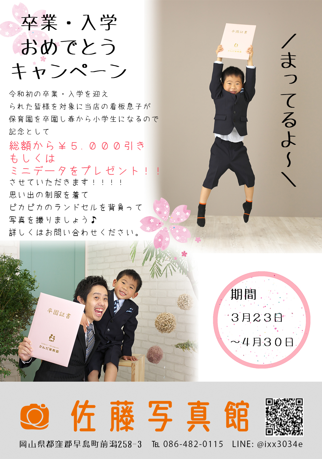 卒業・入学おめでとうキャンペーン!! 2020年3月23日 最終更新日時 : 2020年3月23日 kzn_rq_photo-satou 今年度でご卒園・卒業・入園・入学をむかえられた皆様 おめでとうございます!!! そして、当店の看板息子も今年度で保育園を卒業しました。 コロナの影響で卒園式ができるのかとっても不安でしたが、なんとか無事式にも参加できました。 おめでたい祝いの時期でもあるので、卒業・入学キャンペーンをしようとひらめきました!!! 名づけて『だいきくん☆おめでとうキャンペーン!!!』 お気軽にお問い合わせくださいね♪ [ブログ(署名)]